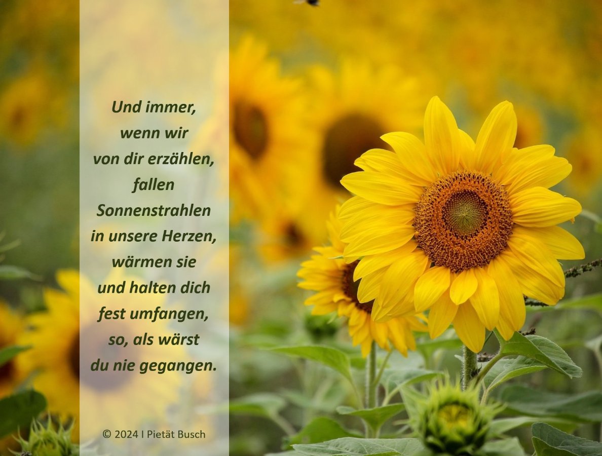 Ein geliebter Mensch ist von euch gegangen, aber nicht genommen worden. Sie hinterlässt eine leuchtende Spur in eurem Leben und es sei ein Trost, dass ihr sie so lange bei euch haben durftet.